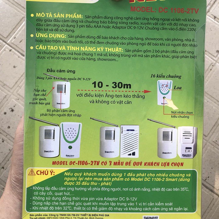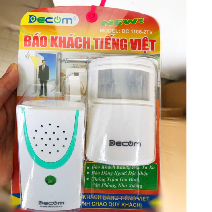 MÔ TẢ Chuông báo khách, báo động chống trộm hồng ngoại không dây. sản xuất tại Việt NamƯU ĐIỂM HƠN SO VỚI THIẾT BỊ TRUNG QUỐC LÀ CÓ THỂ BÁO KHÁCH BẰNG TIẾNG VIỆT ( BING..POONG…KÍNH CHÀO QUÝ KHÁCH) VÀ ĐẶC BIỆT ĐƯỢC TÍCH HỢP CHUÔNG BÁO ĐỘNG GIÚP BẠN CÓ THỂ CÀI CHỨC NĂNG BÁO TRỘM ĐỘT NHẬP NHÀ BẠN.