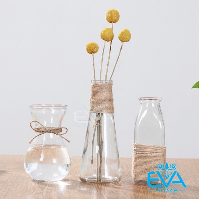 - Bộ sản phẩm gồm : 3 lọ hoa thuỷ tinh loe, tam giác và vuông , 3 Mét Dây Bố Trang Trí