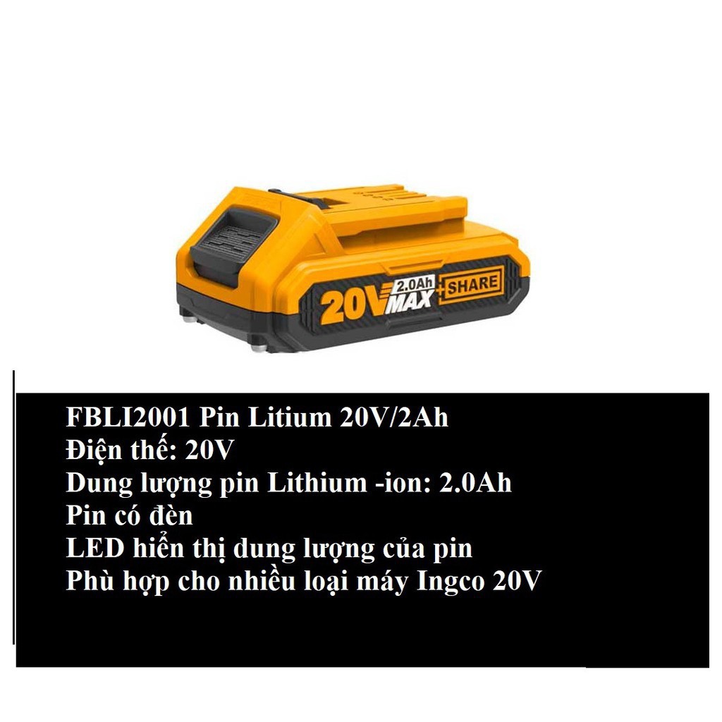 Pin Sạc 20V ingco Pin FBLI2001 20V/2Ah , Pin FBLI2002 20V/4.Ah, Sạc 20V FCLI2001