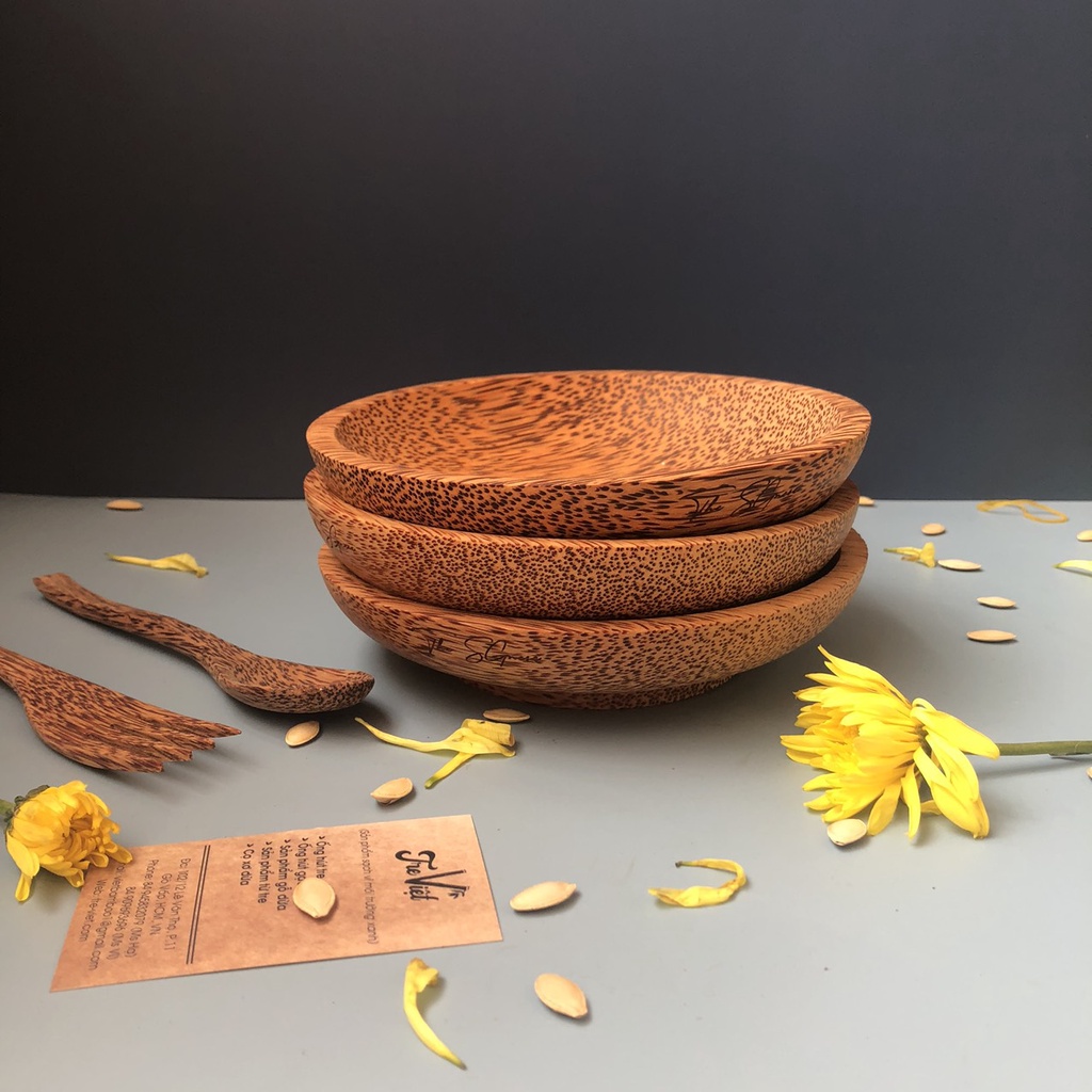 Tô gỗ dừa- Dĩa gỗ dừa- Chén gỗ dừa ăn cơm- Chén gỗ dừa nhỏ đựng nước chấm- Được làm hoàn toàn từ gỗ dừa tự nhiên, không sử dụng hoá chất