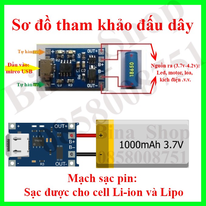 LƯU Ý : Mạch chỉ sạc cho pin định danh 3.7V, hoặc ghép song song nhiều cell 3.7V, KHÔNG PHÙ HỢP pin ghép nối tiếp (nối tiếp là tăng điện áp)