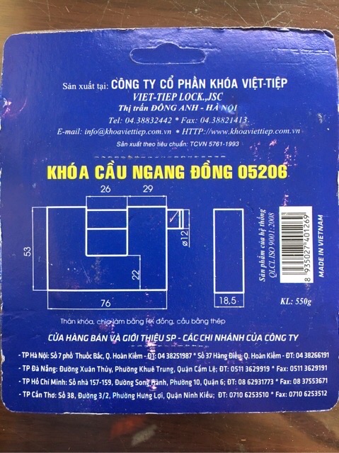 Nhà cửa & Đời sống > Bảo hộ gia đình > Khóa, ổ khóa || KHOÁ VIỆT TIỆP CẦU NGANG ĐỒNG CÁC CỠ 05206 -CN971- CN974Còn hàng