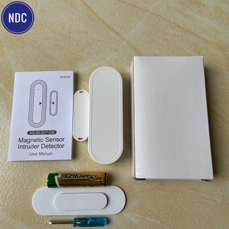 Sản phẩm bao gồm bộ cảm biến và má từ, kèm theo 1 pin AAA Alkaline (được tặng kèm), 1 tô vít nhỏ để mở nắp pin và 2 miếng băng dính 2 mặt để gắn vào cửa