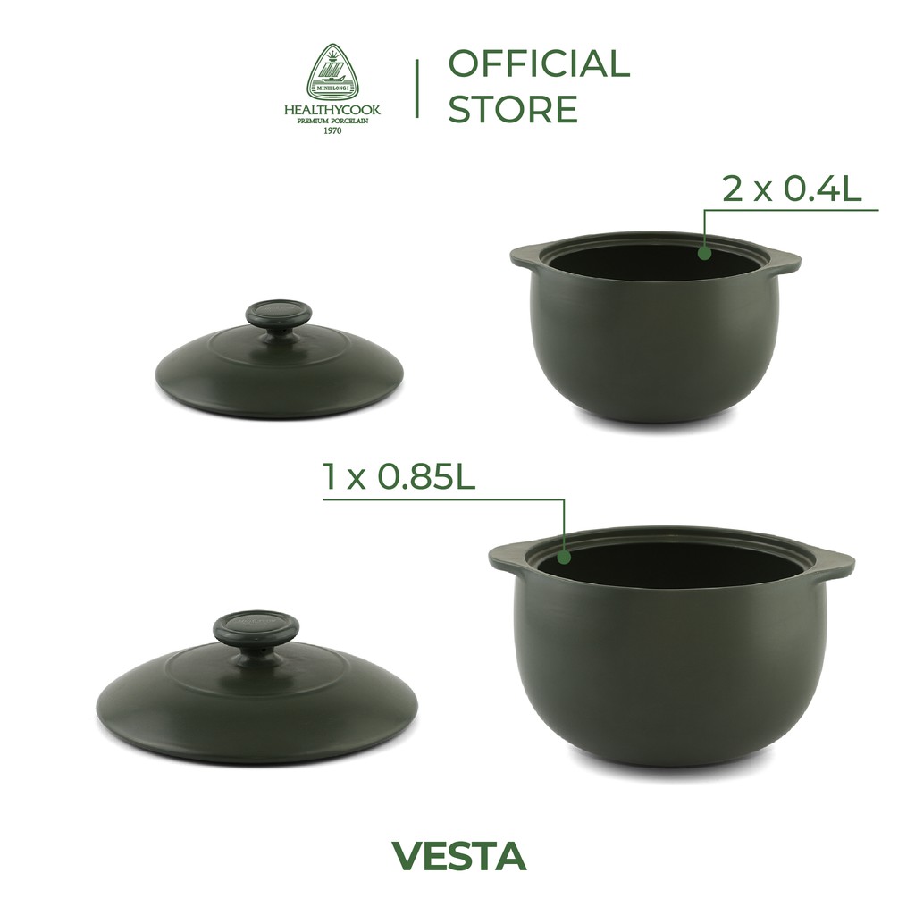 + 2 Nồi dưỡng sinh Vesta 0.85L. Kích thước: 16.84 x 13.58 x 12.2 (cm).
