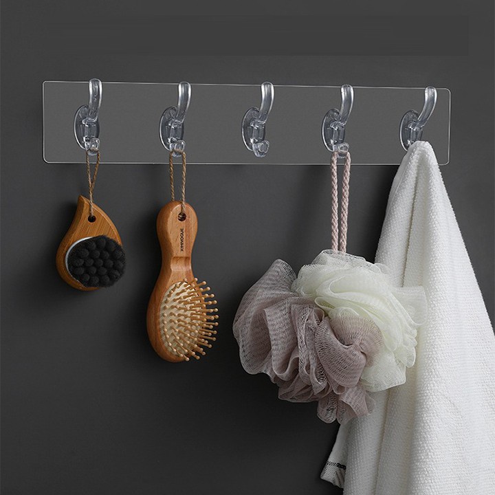 Nhà cửa & Đời sống > Sắp xếp nhà cửa > Móc treo || (Hàng có hộp) Thanh dán tường treo đồ 5 móc trong suốt siêu dính (HSN)Còn hàng