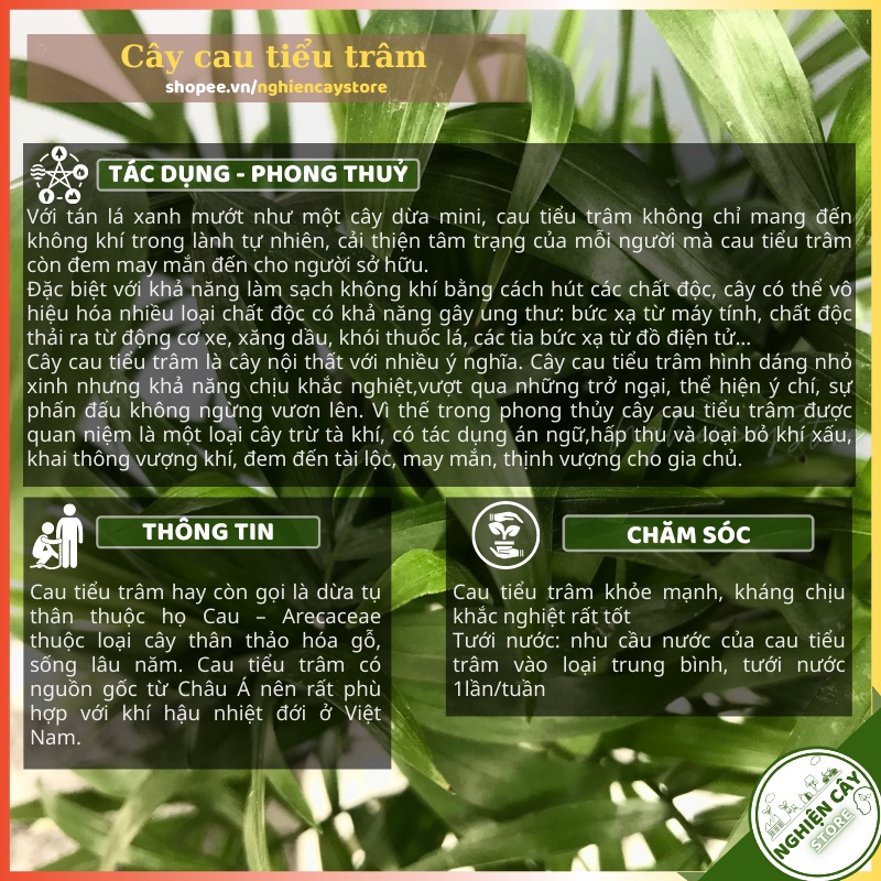 Với tán lá xanh mướt như một cây dừa mini, cau tiểu trâm không chỉ mang đến không khí trong lành tự nhiên, cải thiện tâm trạng của mỗi người mà cau tiểu trâm còn đem may mắn đến cho người sở hữu. Không cần dùng đến các loại máy lọc không khí tốn kém, chỉ cần trưng vài chậu cau tiểu trâm trong phòng bạn đã có bầu không khí tuyệt vời.