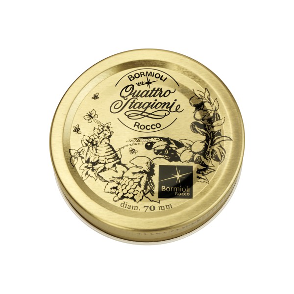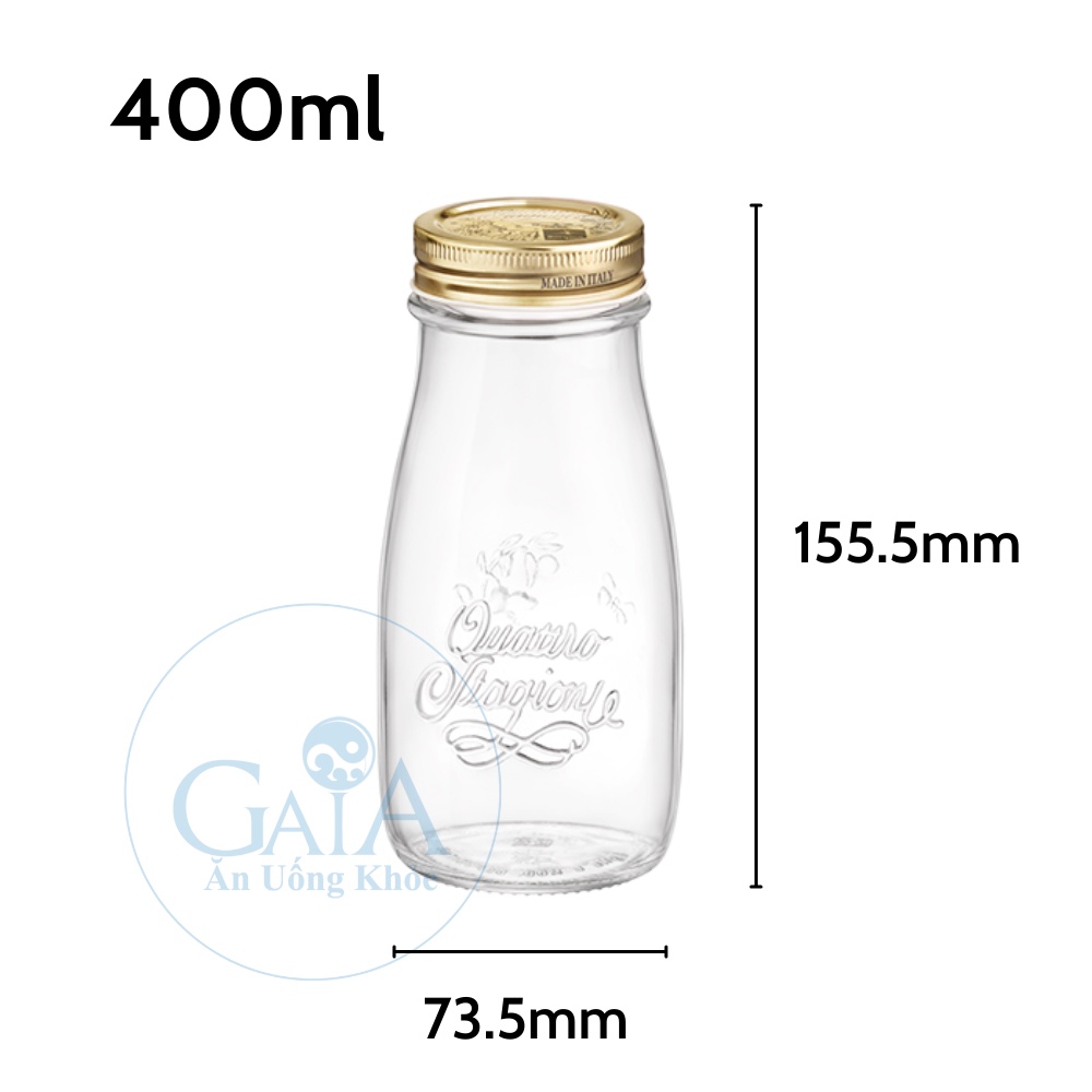 - Nắp đậy màu vàng đồng nổi bật có in logo thiết kế dạng xoay giúp đậy kín và cách ly thực phẩm khỏi bụi bẩn. Phần thân hũ cách điệu với logo Quattro Stagioni in nổi vừa đẹp mắt vừa có công dụng chống trơn trượt và làm nổi bật sự tinh tế của chất liệu thủy tinh.