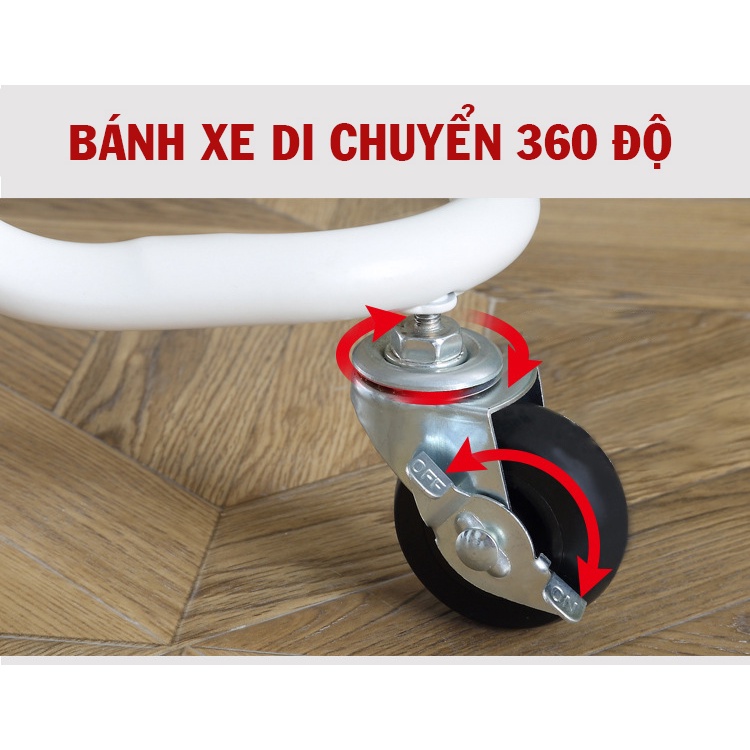Bánh xe có thể xoay 360 độ. Có khóa bánh chống trơn trượt.