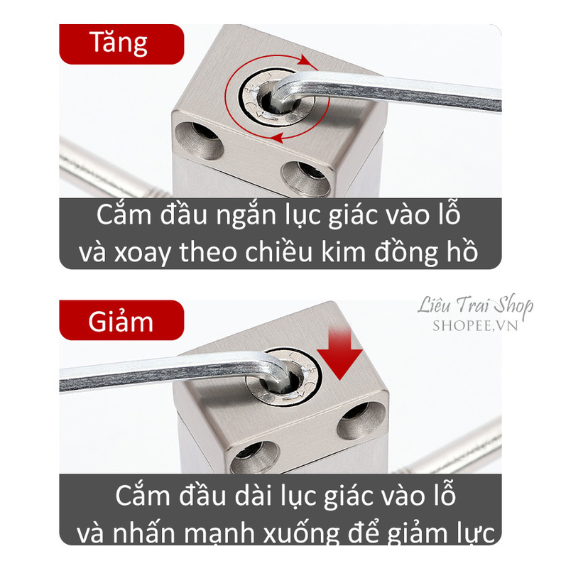 Dùng lục giác đi kèm cắm vào lỗ nhỏ phía trên xoay theo chiều kim đồng hồ có thể chình được sức căng lò xo , qua đó điều chỉnh lực đẩy bản lề