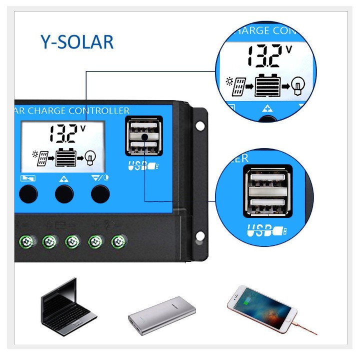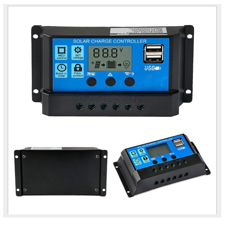 Là thiết bị thực hiện chức năng điều tiết sạc cho ắc-quy theo công nghệ xung PWM, bảo vệ cho ắc-quy chống nạp quá tải và xả quá sâu nhằm nâng cao tuổi thọ của bình ắc-quy, và giúp hệ thống pin mặt trời sử dụng hiệu quả và lâu dài. - Bộ điều khiển còn cho biết tình trạng nạp điện của Panel mặt trời vào ắc-quy giúp cho người sử dụng kiểm soát được các phụ tải. - Bộ điều khiển còn thực hiện việc bảo vệ nạp quá điện thế (>13,8V) hoặc điện thế thấp (<10,5v) , có chế độ hẹn giờ bật đèn khi trời tối , có 2 ngõ USB 5v sạc ĐTDĐđặc biệt loại điều khiển sạc có 3 nút tùy chỉnh linh hoạt giúp người sử dụng có thể tùy chỉnh mức điện áp sạc phù hợp cho từng loại acquy , chỉnh hẹn giờ tự bật đèn khi trời tối (khi trời tối đèn tự sáng và tắt sau mấy giờ do người dùng cài đặt)