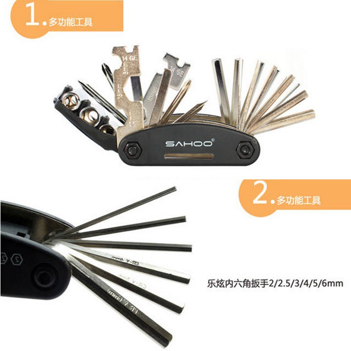 Bộ sử chưa đa năng sahoo rất đa năng và tiên dụng, nhỏ gọn rễ mang theo.Bộ dụng cụ có đầy đủ đồ để tháo lắp sửa chữa cho chiếc xe đạp của bạn, như là