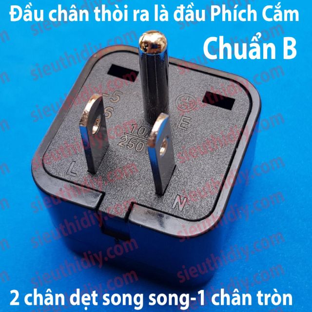 Phích chuyển 3 chân Mỹ,Nhật 1 tròn 2 dẹt song song ra ổ cắm đa năng:- Là một dạng phích cắm có 1 đầu như phích cắm 3 chân ( 1 tròn 2 dẹt song song ) chuẩn Mỹ, Nhật. Chuyển ra 1 Ổ cắm hoặc Chia ra 2-3 Ổ cắm Đa Năng có khả năng cắm được nhiều chuẩn phích cắm khác nhau ( xem hình các chuẩn phích cắm ).