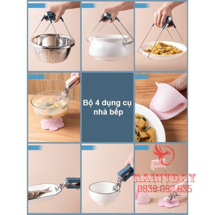 Dụng cụ kẹp gắp đồ nóng thức ăn đa năng inox chống phỏng kèm bộ găng tay, miếng lót nồi siliconBộ dụng cụ nhà bếp chống nóng kẹp gắp đồ ăn nóng, nhấc nồi, miếng lót nồi silicon