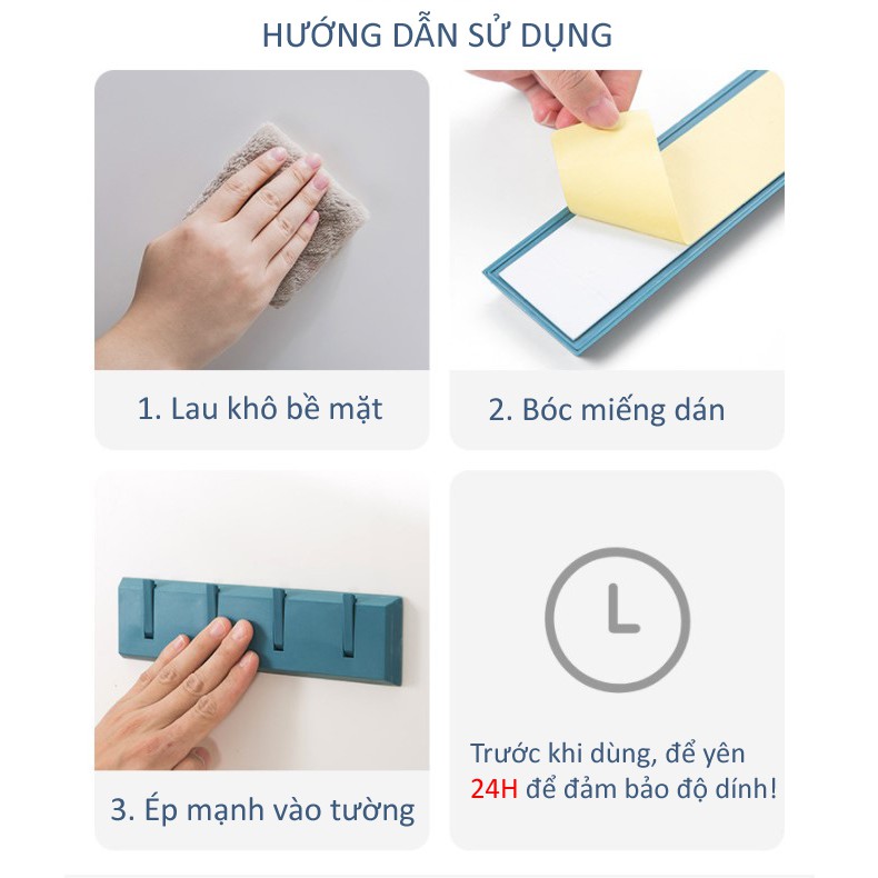 - Móc treo quần áo dán tường chịu lực với 4 đầu móc trên cùng 1 sản phẩm: dài 21cm - rộng 5.5cm