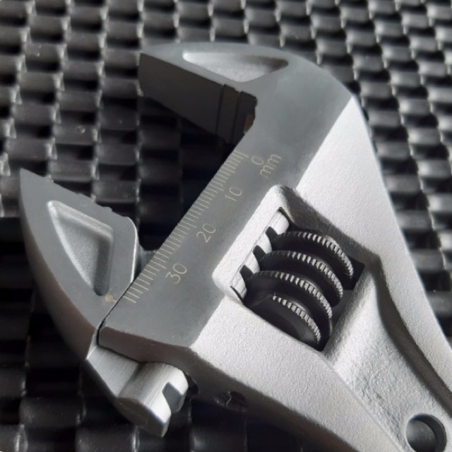 Phần đầu của mỏ lết còn được thiết kế một dãy thước đo , giúp cho người dùng dễ dàng điều chỉnh đến kích thước cần xiết một cách dễ dàng.