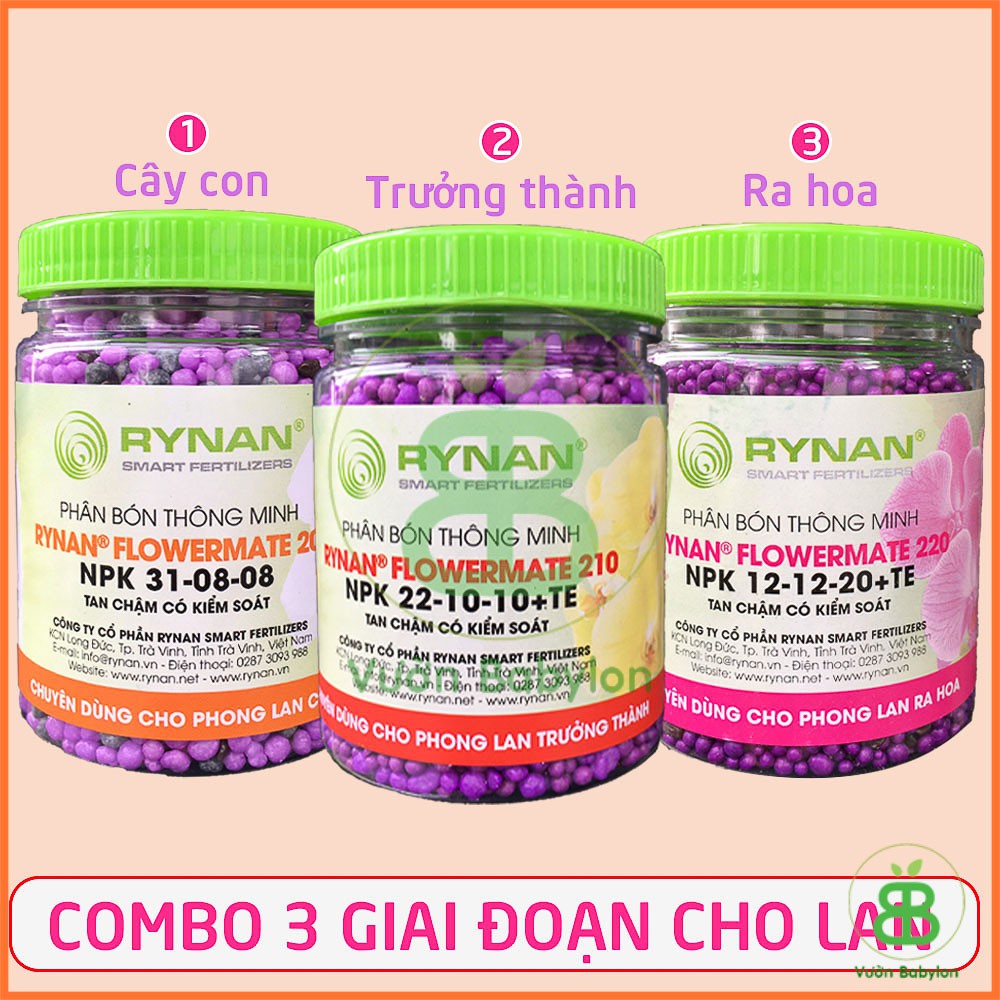 Vườn Babylon xin kính chào quý khách!Bộ 3 Phân Tan Chậm Thông Minh Rynan 200 210 220 Chăm Sóc Hoa Lan Lọ 150G
