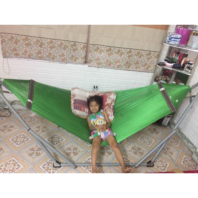 -Lưới võng có cán thép 2 đầu giúp võng luôn xòe rộng, không bị lật, không vướng vào khung võng khi đung đưa.