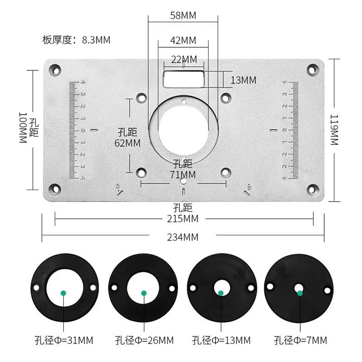 _ Dùng được cho nhiều loại máy phay như Maki ta 3701, 3703, 3709, RT0700C, máy DCA, máy phay Bos ch GMR1... và các loại máy phay có khoảng cách các lỗ bắt vít của đế máy là 62x70mm (ngoài ra mặt dưới của tấm gá có khoan mồi sẵn nhiều hệ lỗ để lắp các loại máy phay có hệ lỗ của đế khác với hệ 62x70mm)_ Dùng được cho máy phay trục 6.35mm và 12.7mm