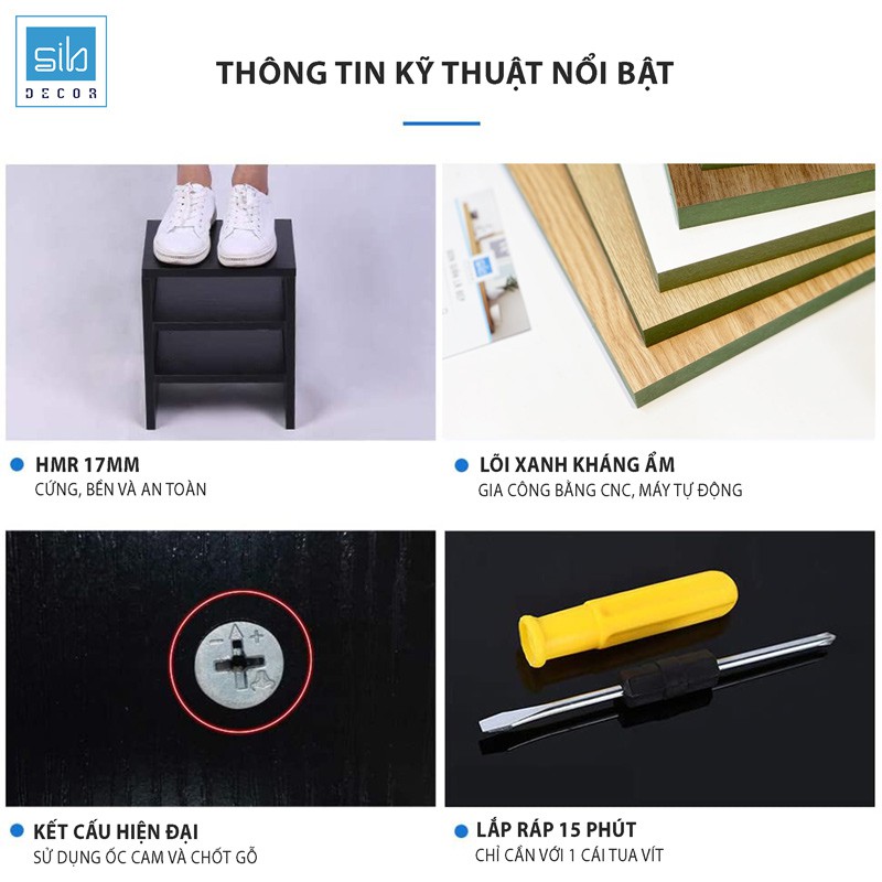 Lời ngỏ: Khi so sánh về giá sản phẩm, quý khách hàng nên lưu ý về những mục sau:+ Chất liệu: Kệ của SIB sử dụng chất liệu HMR - lõi xanh kháng ẩm, bề mặt phủ melamine có khả năng chống trầy xước (KHÔNG phải gỗ MDF màu vàng nhạt thông thường).