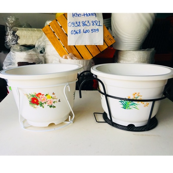 - Chậu hoa văn và chậu khía đồng bộ với móc treo.