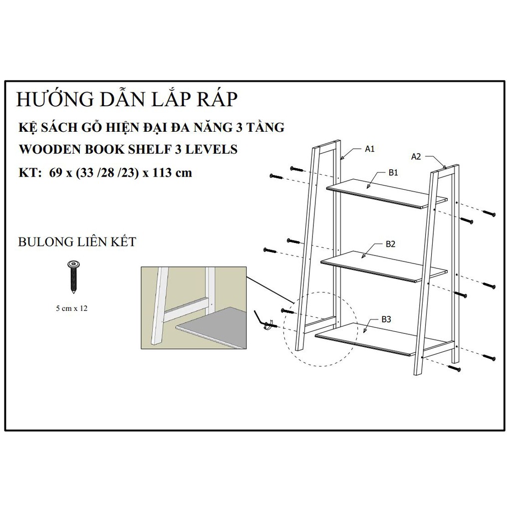 • Kích thước sản phẩm: 69 x 33 x 113 cm (Dài x Rộng x Cao) - Khoảng cách tầng 28cm