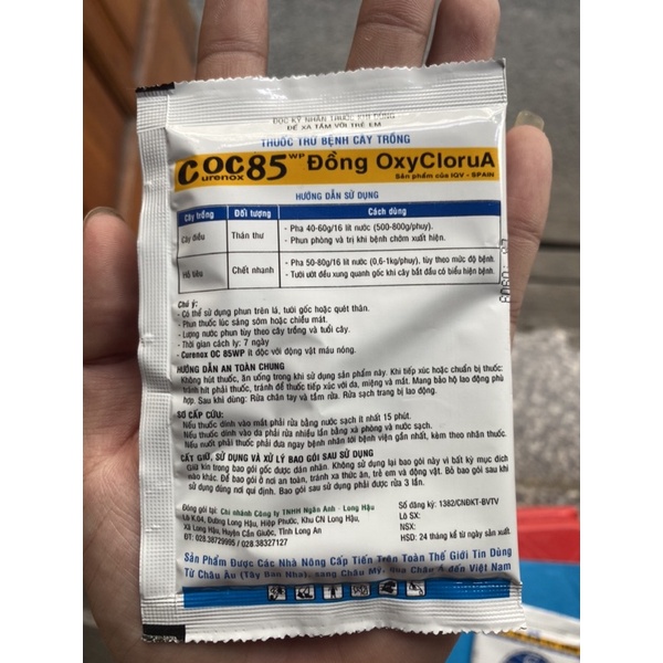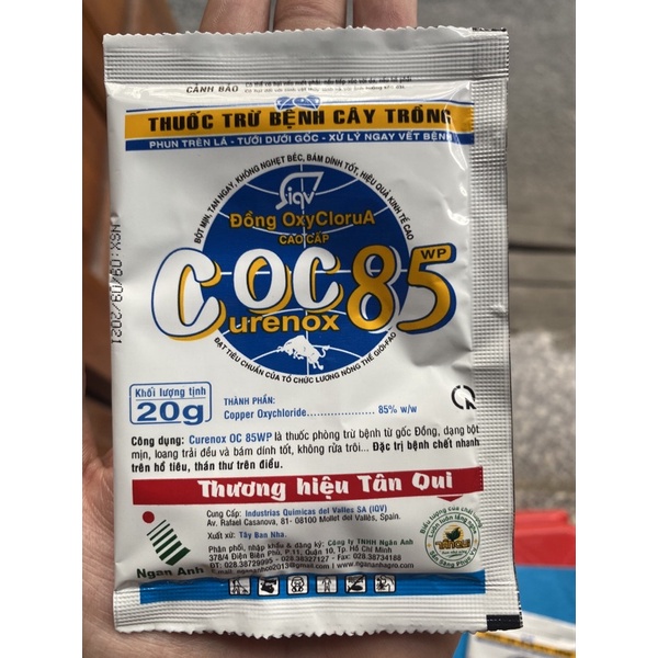 - Công dụng: COC85wp là thuốc phòng trị nấm bệnh, diệt vi khuẩn căn bản từ gốc đồng qua hệ thống thân, lá và rễ dùng để phòng trị các bệnh hại như: Thán thư trên cây xoài, sương mai trên cây cà chua, sẹo các loại cây có múi, cây ăn trái khác, các loại cây công nghiệp,.. Ngoài phòng trị ra, COC85 còn cung cấp vi lượng đồng giúp tăng năng suất và chất lượng nông sản. COC85 ít độc cho ong, cá, gia súc, gia cầm, con người và không ảnh hưởng đến môi trường sinh thái.