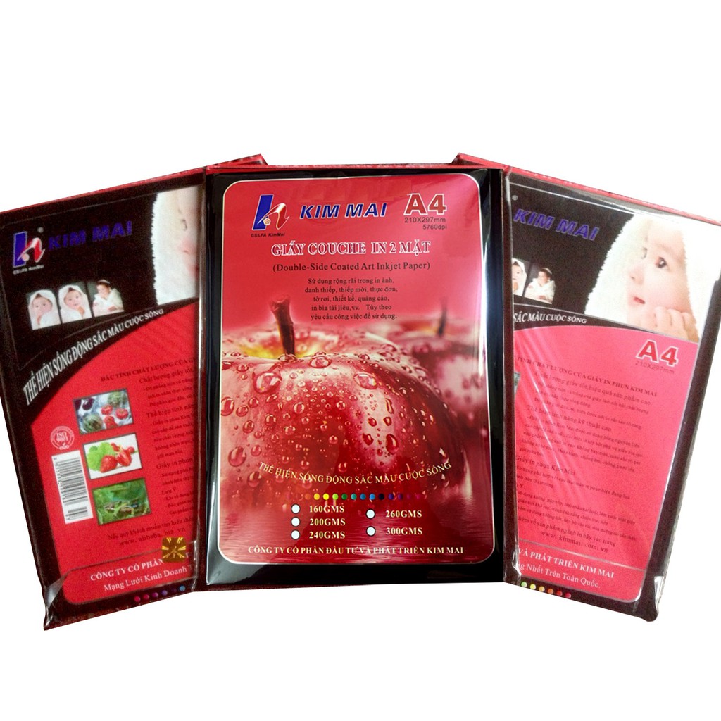 - Giấy Couche in 2 mặt Kim Mai được sử dụng bằng nguyên liệu giấy cao cấp để sản xuất, đặc biệt là lớp bột phủ và giấy bìa tạo nên chất lượng ảnh in cao, không bay màu, màu sắc rõ nét không nhòe mực, khô nhanh, chống nước tốt, giữ màu bền, phù hợp với các loại máy in phun hiện đang lưu hành trên thị trường.- Sử dụng rộng rãi trong in ảnh, danh thiếp, thiếp mời, thực đơn, tờ rơi, thiết kế, quảng cáo, in bìa tài liệu...