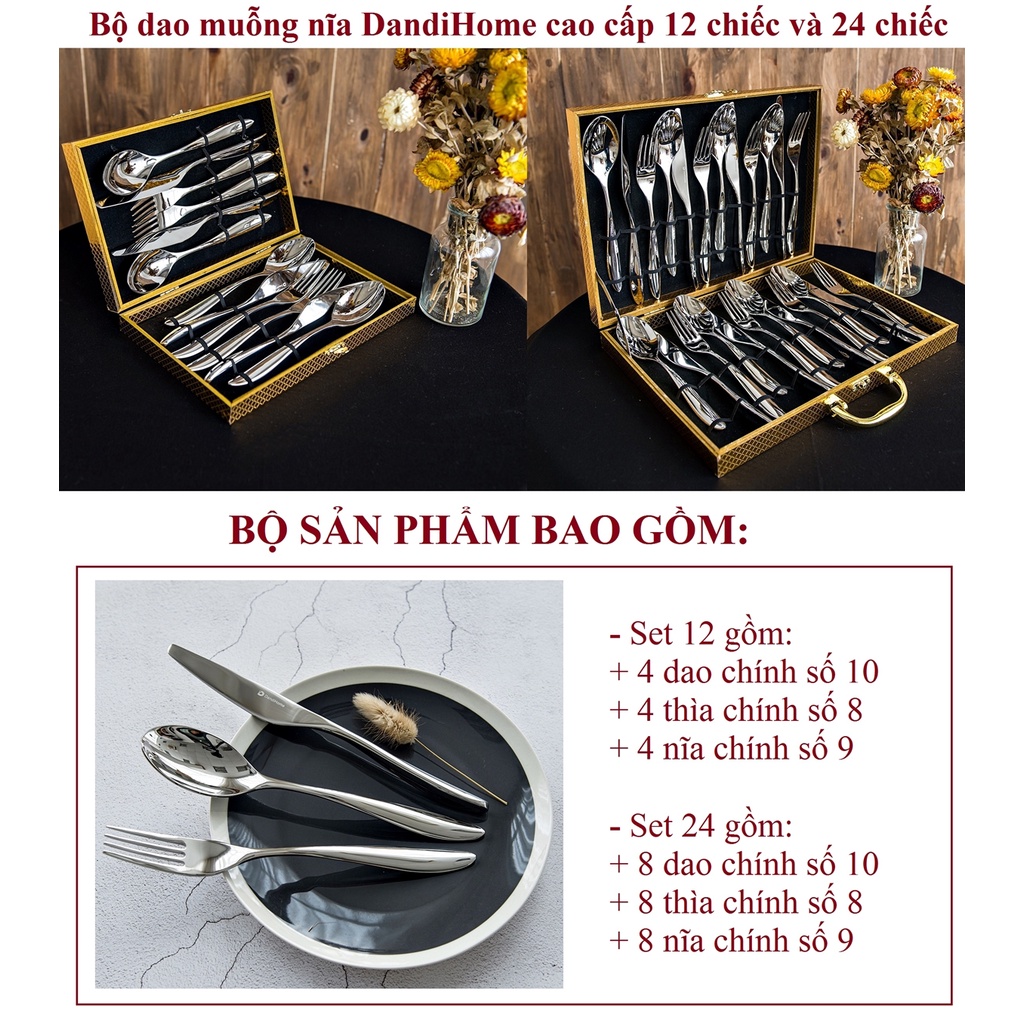 Bộ dụng cụ bàn ăn dao thìa nĩa Inox 304 DandiHome cao cấp đi kèm hộp sang trọng
