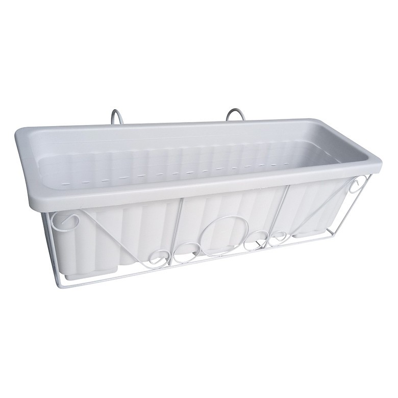 Bộ kệ treo ban công và chậu nhựa trồng rau màu trắng gồm chậu nhựa thông minh trắng, đi kèm với khung sắt sơn tĩnh điện màu trắng, giúp cho ngôi nhà của bạn thêm tươi sáng và mát mắt.Cao 19 cm x Dài 63.5 cm x Rộng 22 cm