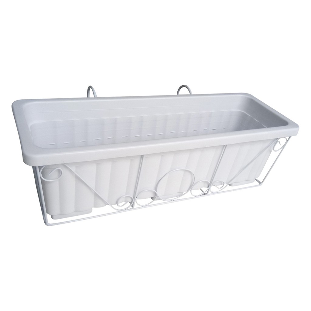 Bộ kệ treo ban công và chậu nhựa trồng rau màu trắng gồm chậu nhựa thông minh trắng, đi kèm với khung sắt sơn tĩnh điện màu trắng, giúp cho ngôi nhà của bạn thêm tươi sáng và mát mắt.Cao 19 cm x Dài 63.5 cm x Rộng 22 cm