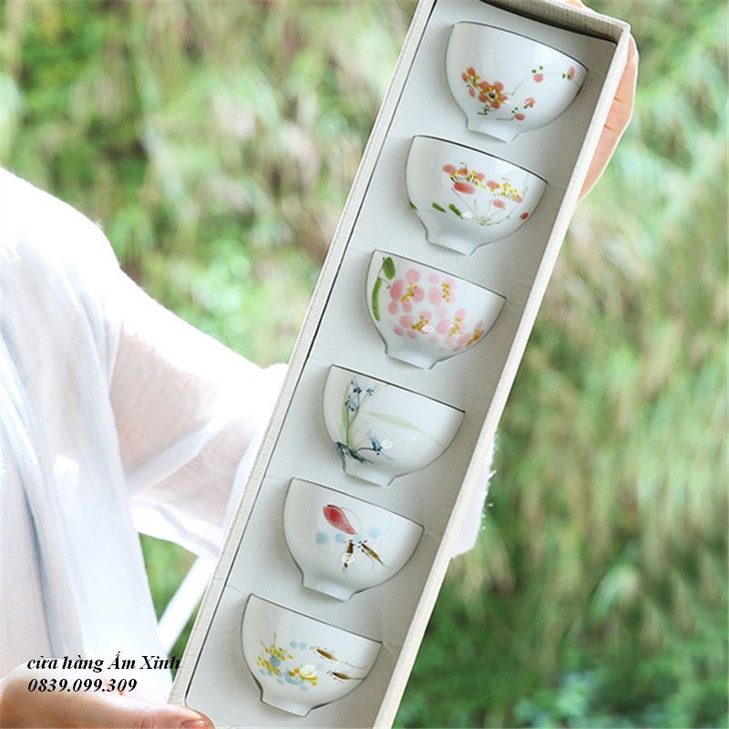 Bộ chén sứ Cảnh Đức vẽ tay thủ công (Bộ 06 chiếc kèm hộp quà)