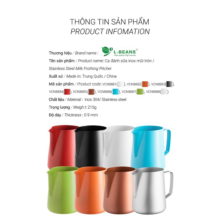 ▪Ca đánh sữa cuả hãng L-BEANS sản xuất từ inox dành riêng cho thực phẩm, đảm bảo an toàn vệ sinh, không gây ảnh hưởng tới sức khỏe.