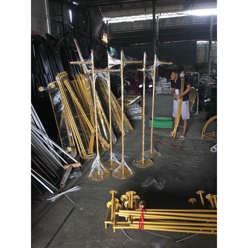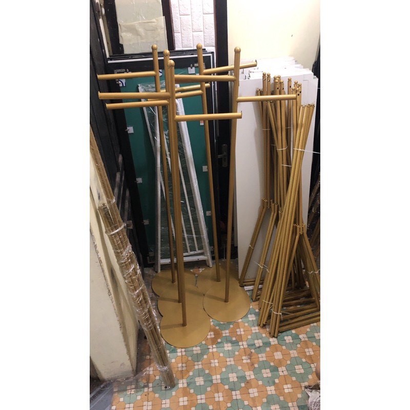 kệ treo quần áo, cây treo quần áo mẫu: kệ bằng kim sơn nhũ vàng, có 2 tầng treo quần áo, tầng 1 cao 1m5, tầng 2 cao 1m6, tiện lợi cho treo quần áo mẫu livestream, treo quần áo mẫu cho shop và cửa hàng thời trang.