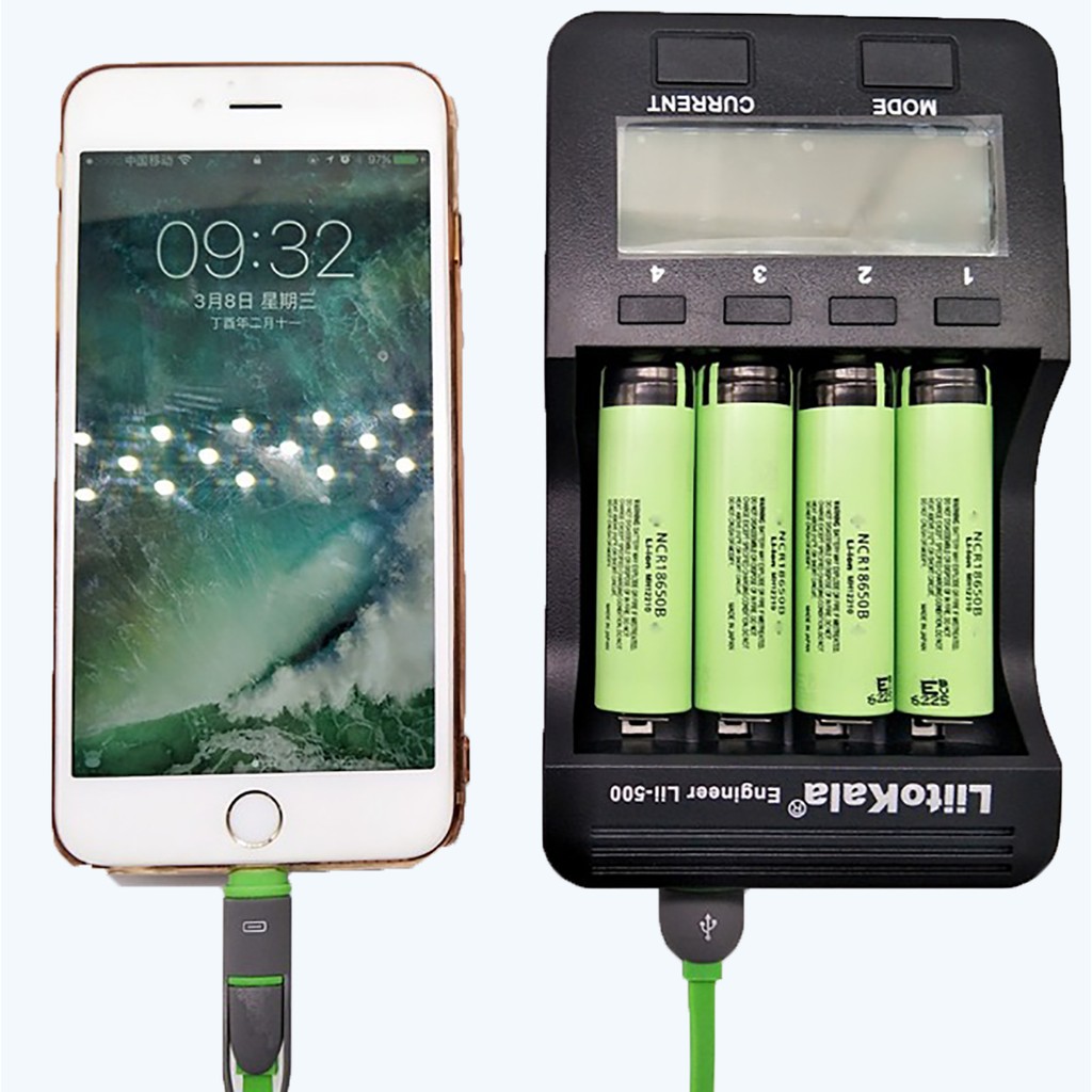 - Đầu ra USB có thể sạc các thiết bị điện tử 5V của bạn (như điện thoại) khi đặt pin Li-ion vào khe cắm.