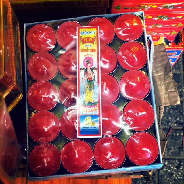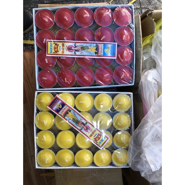 Nến nhôm hiện nay không chỉ ứng dụng trong cúng kiến mà còn được sử dụng rộng rãi trang trí trong các quán cf nhà hàng,khách sạn,... 1 hộp 100 viên, có 3 màu trắng,đỏ ,vàng. Thời gian cháy 4h.Đảm bảo không mùi không khói.Địa Chỉ :290a ba đình p10 q8