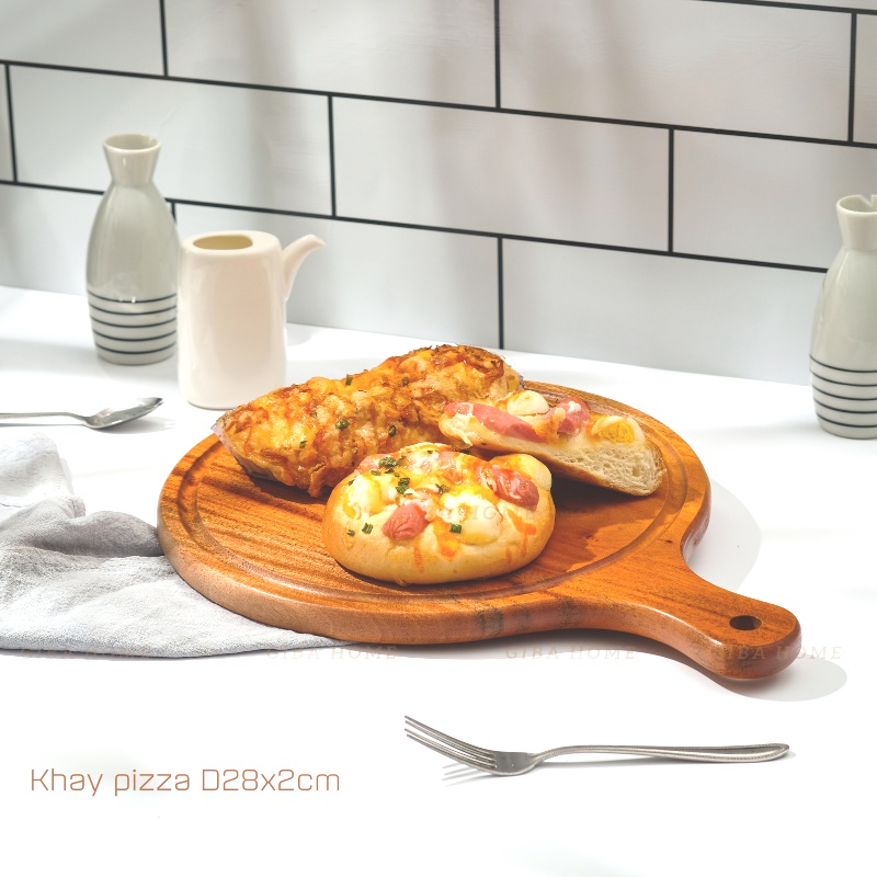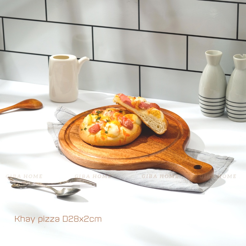 Khay gỗ tròn có tay cầm đựng pizza GIBA, thớt dùng làm khay gỗ decor chụp ảnh sản phẩm