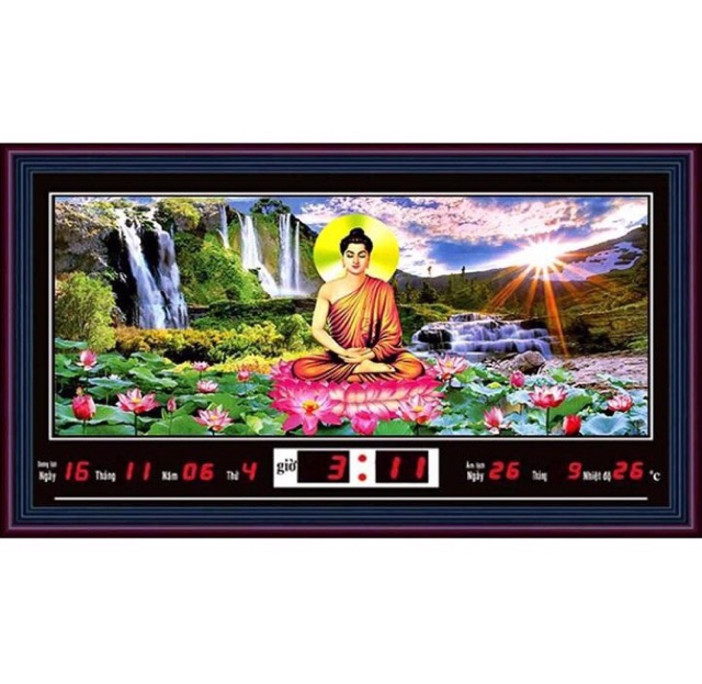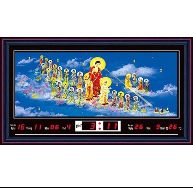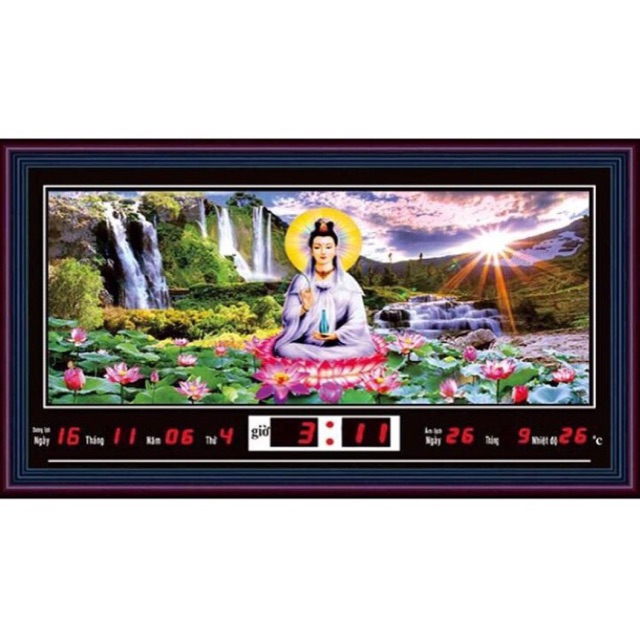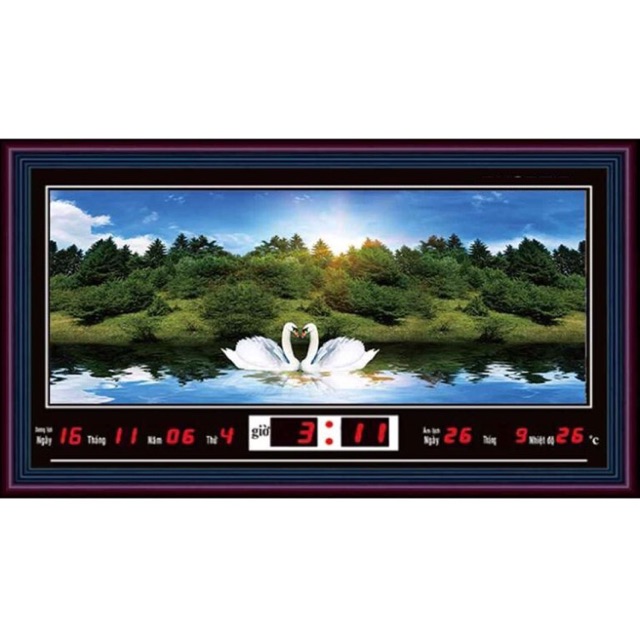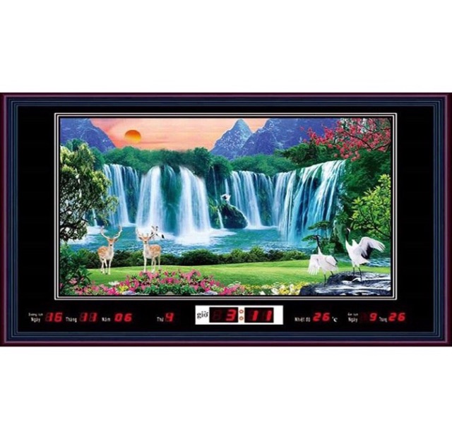 • Tranh có Lịch Âm - Lịch Dương - Giờ - Thứ rất tiện . Vừa là tranh trang trí nhà cửa vừa coi giờ giấc , coi ngày , tháng , năm .... rất tiện và cần thiết trong mọi gia đình cho việc trang trí nhà cửa, các căn hộ , chung cư hiện đại ... + Tranh được bao bọc bên ngoài bằng viền khung gỗ bền, đẹp và rất sang trọng. Mặt phía trước được làm bằng kính phía sau là lớp ván trống mốc, ẩm ướt ...