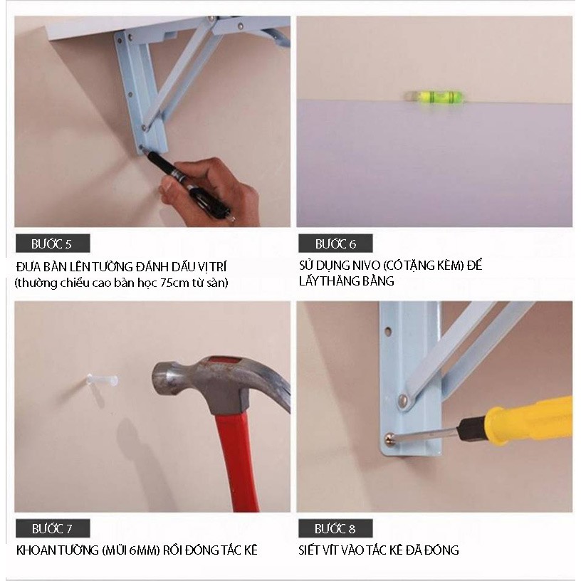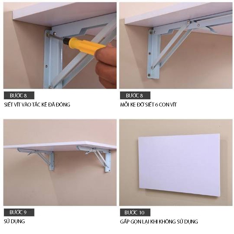 - Bộ sản phẩm gồm đầy đủ phụ kiện: ke gấp 2 cái, vít, tắc kê, hướng dẫn lắp đặt và tặng kèm nivo mini (thước thủy để lấy cân bằng).