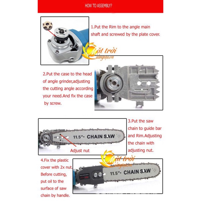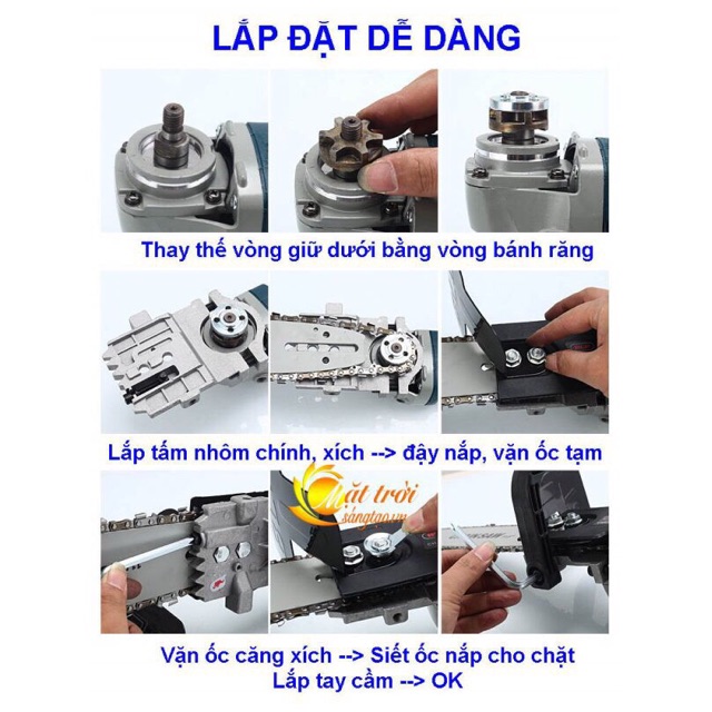 Bộ dụng cụ cưa xích này sẽ giúp bạn giải quyết được vấn đề này, bộ dụng cụ này gồm 1 lưỡi cưa xích và một số phụ kiện để biến chiếc máy mài góc thành máy cưa xích. Ưu điểm của bộ sản phẩm này là dễ sử dụng, hướng dẫn kĩ trước khi mua, có thể giúp bạn dễ dàng lắp đặt.