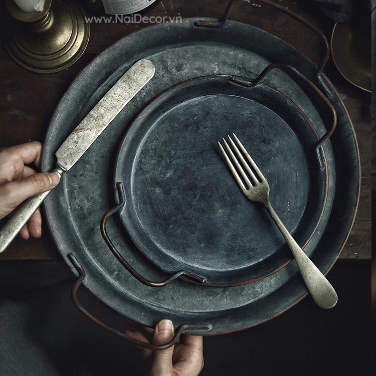 Khay kim loại xước tròn có tay nắm kiểu retro, vintage