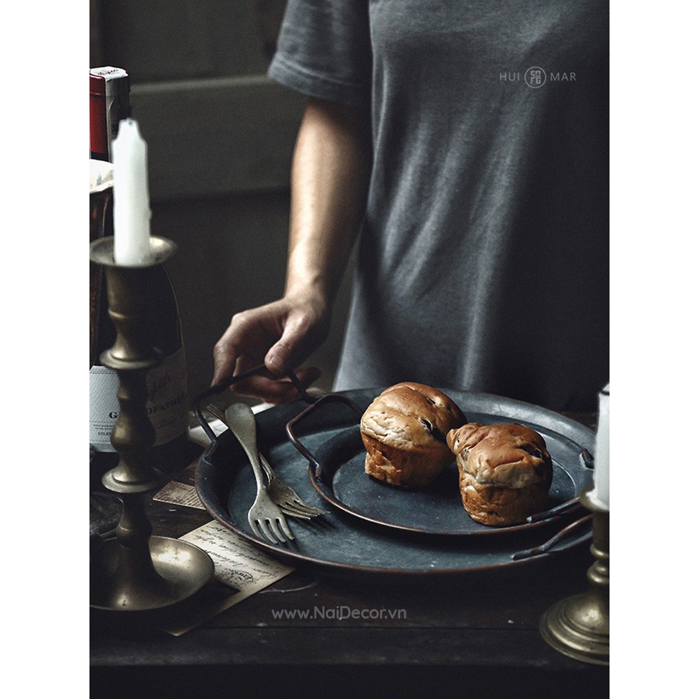 Khay tròn Vintage có tay nắm rất phù hợp cho những bạn hay chụp đồ ăn, đồ uống như bánh mì, ngũ cốc, trái cây, các món ăn kiểu truyền thống,…