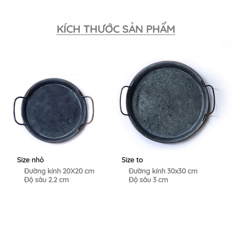 - Khay kim loại xước hình tròn, có tay nắm, có 2 kích cỡ: