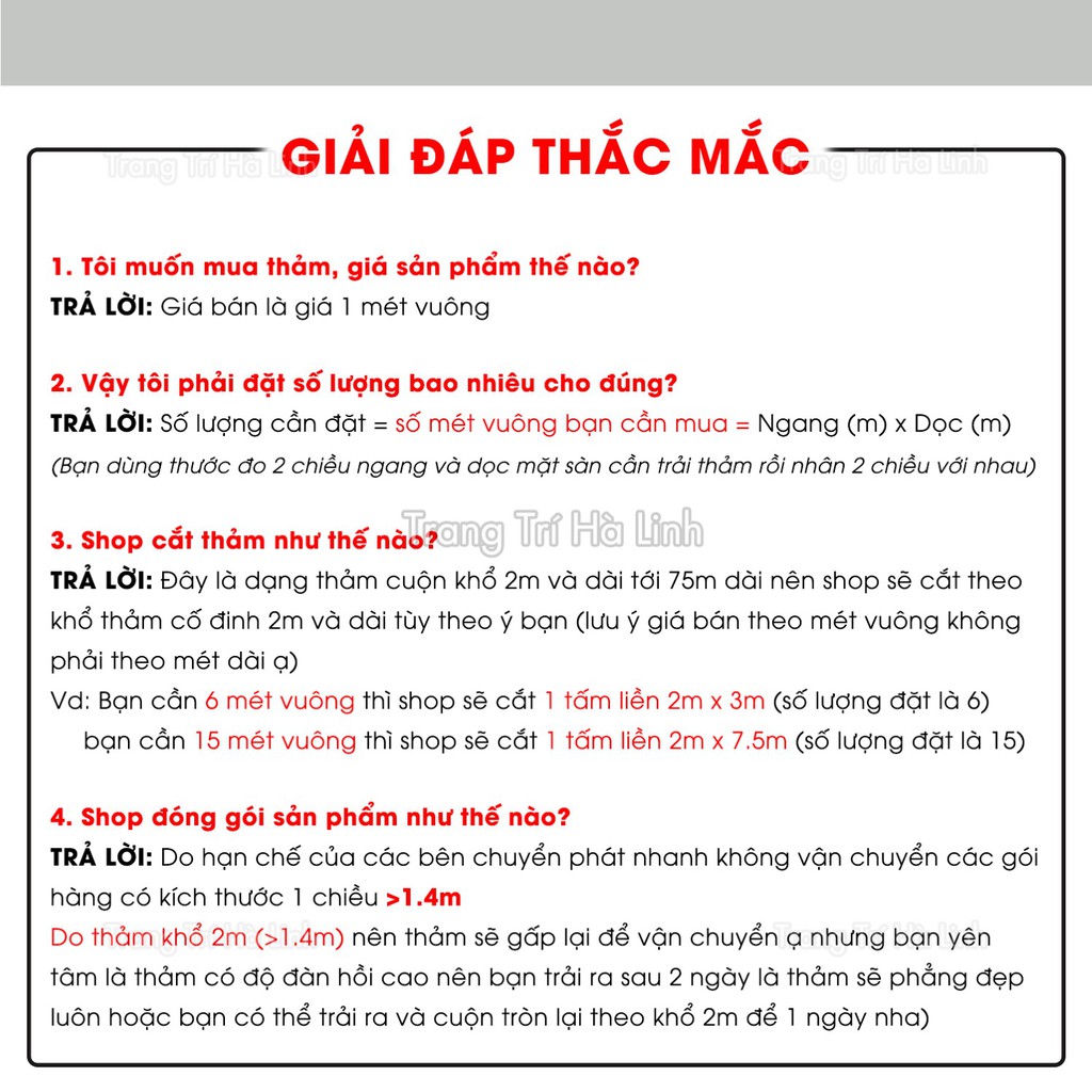 Vì khổ cuộn thảm là 2m ngang và kéo dài tới 50m dài nên shop cắt theo khổ thảm 2m ngang cố định và dài tùy ý