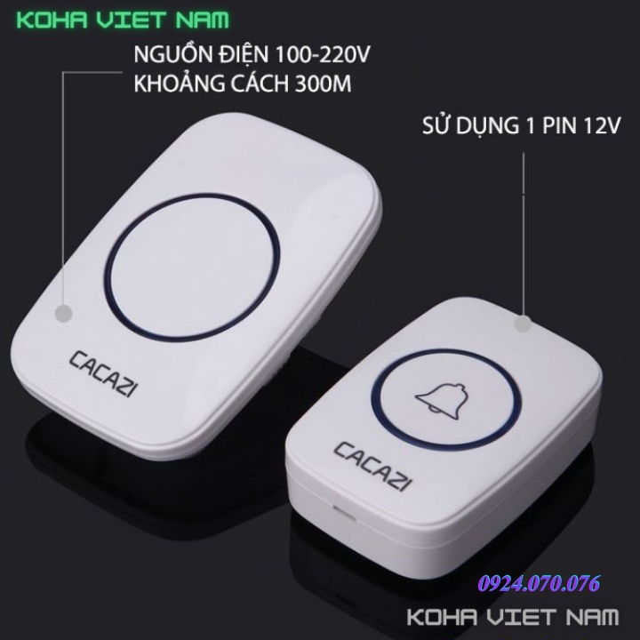 Quý khách lưu ý. Đây là bộ chuông bấm. Phải bấm thì chuông mới kêu . Chứ không phải chuông báo khách có ng đến tự kêu nhé !1.Chuông cửa cao cấp không dây Cacazi Tặng kèm thêm 1 viên pin dự phòng ( ngoài pin đã có sẵn )
