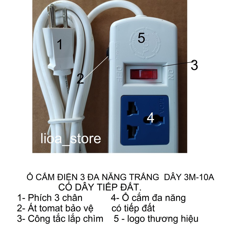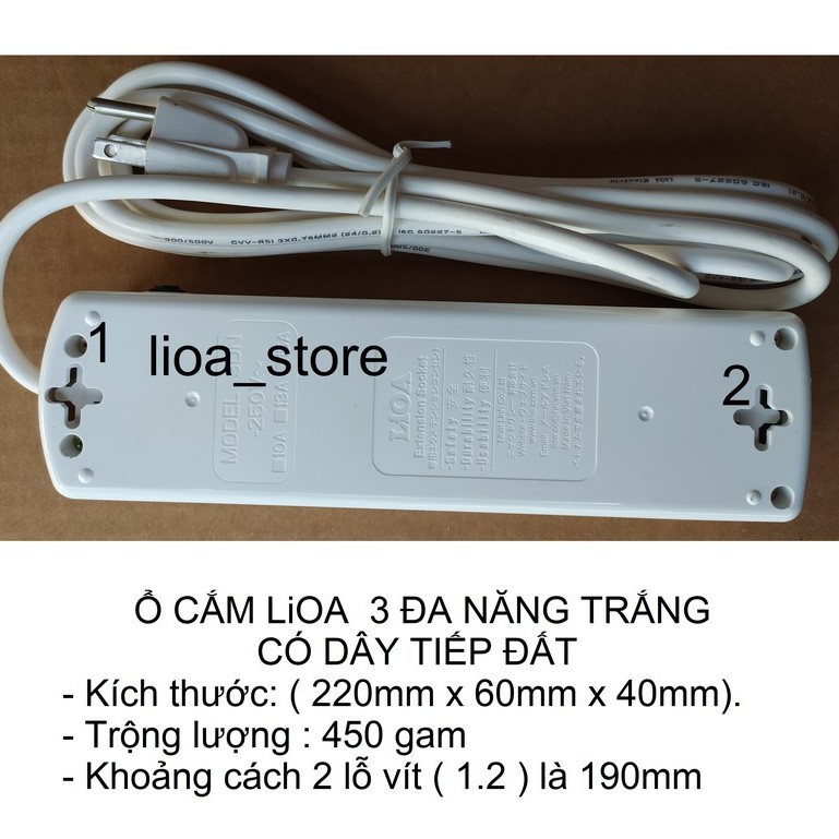 - * MỤC ĐÍCH : Ổ CẮM ĐIỆN LiOA 3 ĐA NĂNG CÓ DẤY TIẾP ĐẤT dùng để CHỐNG RÒ ĐIỆN và chiệt tiêu dòng cảm ứng của cấc thiệt bị văn phòng, các thiết bị trong sinh hoat nơi cộng cộng,trong gia đình và các lĩnh vực khác trong cuộc sống .....THÔNG SỐ KỸ THUẬT