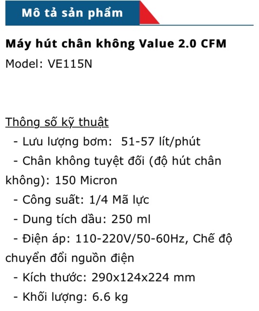 Giới thiệu Máy Hút Chân Không VALUE VE115N 2.0 CFM
