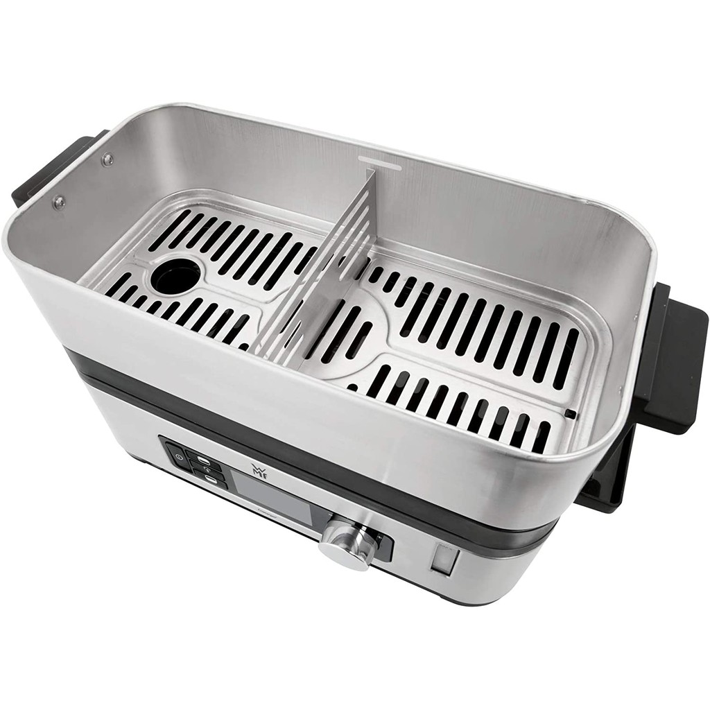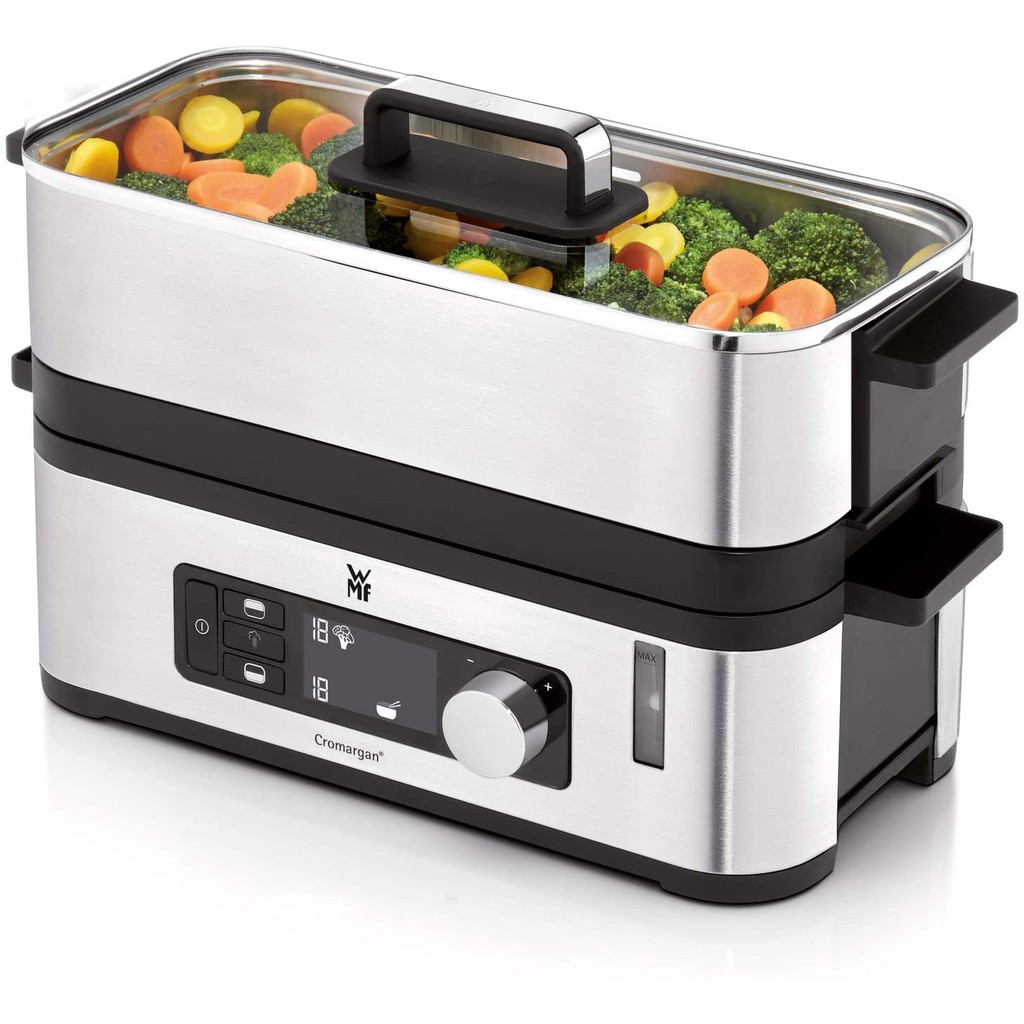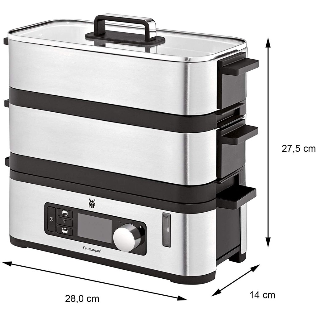 Nồi hấp WMF KÜCHENminis làm bằng Cromargan với nắp thủy tinh cao cấp giữ đúng những gì tên gọi của nó. Với hình dạng bên ngoài nhỏ gọn, nó đảm bảo nấu ăn lành mạnh, hoàn toàn không chứa BPA và không phụ thuộc vào bếp nấu. Là nồi hấp Cromargan nhỏ nhất, với kích thước chỉ 14,4 x 28,4 cm, nó có thể được sử dụng để nấu thịt, cá, rau và các món ăn phụ ở hai mức công suất 900 watt. Nấu theo kiểu gọi món: Nhờ WMF Easy Steaming với hai khoang nấu riêng biệt, mỗi mức có thể được điều chỉnh riêng để bạn có thể chuẩn bị mọi thứ cùng nhau, nhưng quá trình nấu thực tế không bắt đầu cho đến sau đó, tùy thuộc vào cài đặt.