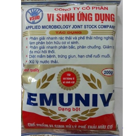 Làm phân bón: 1 gói Emuniv 500 gram dùng để xử lý 2-3 tấn nguyên liệu từ phế phụ phẩm nông nghiệp. Trộn chế phẩm với nguyên liệu hoặc hòa nước rồi tưới đều lên đống ủ sao cho độ ẩm đạt 50%. Dùng bạt, bao rưa hoặc lá cọ để đậy kín để giữ nhiệt và độ ẩm. Sau 7-10 ngày thì tiến hành đảo trộn, tùy thuộc vào nguyên liệu ban đầu mà thời gian ủ từ 25-30 ngày.