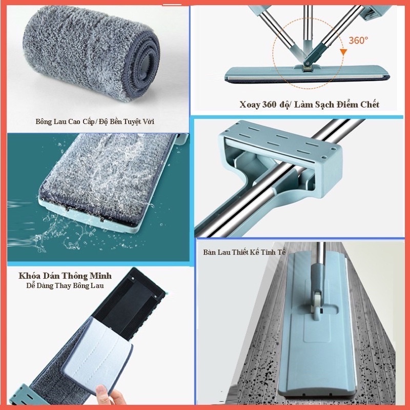 - Miếng bông lau được làm bằng sợi vải cotton mềm mại, thấm hút tốt, có diện tích lớn, mang tới tốc độ làm sạch sàn nhanh và sạch. Ngoài ra, miếng lau còn có thể tháo rời để giặt và phơi rất tiện lợi.