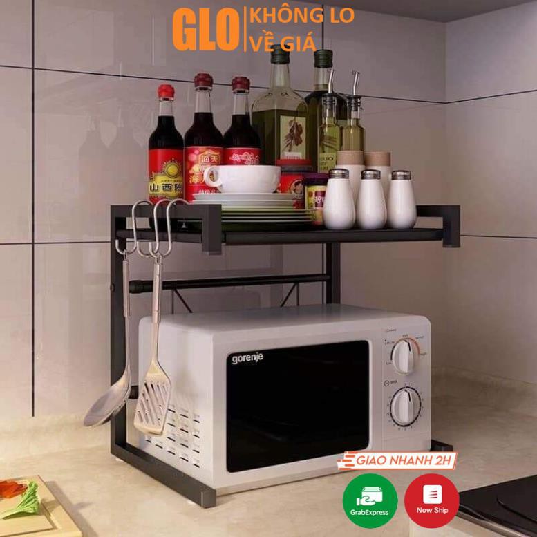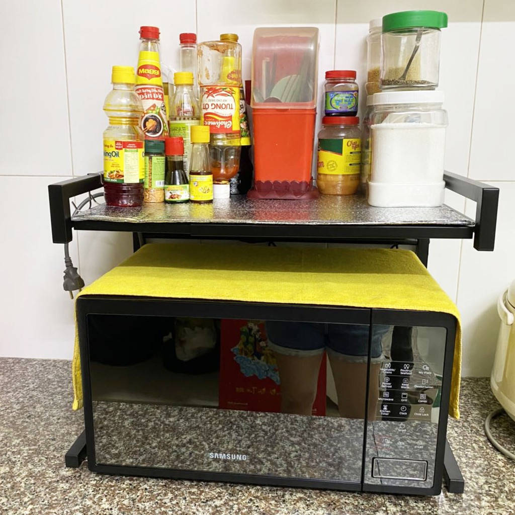 - Kệ có 2 tầng chính, ngăn dưới dùng để lò vi sóng, 2 tầng trên là giá chắc chắn dùng để đồ dùng nhà bếp, lọ gia vị, bình nước, các đồ dùng gia dụng khác.